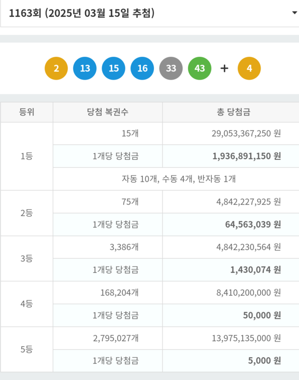 로또복권 운영사 동행복권은 제1163회 로또복권 추첨에서 '2, 13, 15, 16, 33, 43'이 1등 당첨번호로 나왔다고 15일 밝혔다. 2등 보너스 번호세는 '4'가 뽑혔다.