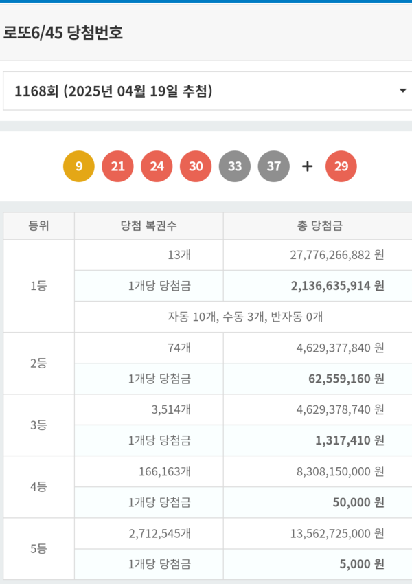 로또복권 운영사 동행복권은 제1168회 로또복권 추첨에서 '9, 21, 24, 30, 33, 37'이 1등 당첨번호로 나왔다고 19일 밝혔다.
