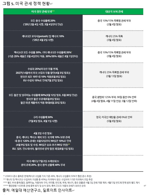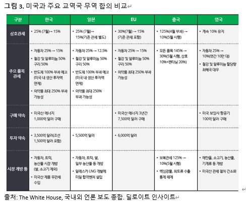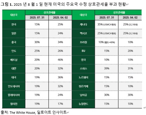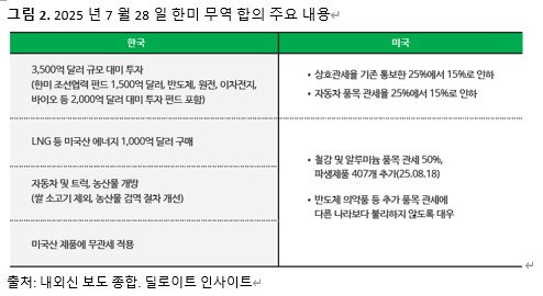 한국 정부와 미국 트럼프 행정부는 하루 전에 상호관세율을 15% 부과하는 무역 합의에 도달했다. 이는 앞서 미일, 미EU 무역 합의와 동일한 조건이다. 이번 합의로 기존 한국에 부과됐던 25% 상호관세율은 10%포인트 하향 조정됐지만, 앞서 한미 자유무역협정(FTA)을 통해 무관세로 수출하던 입장에서는 기존 2.5% 관세율이란 이점이 사라졌음을 의미한다. 이미 자동차 2~3차 협력사들 중 일부는 주문이 끊기는 상황을 경험하고 있다. 자동차의 경우 15% 관세율이 적용될 경우 25% 품목 관세가 부과될 경우와 비교할 때 관세 부담이 약 5조 원 줄어드는 것으로 추산된다. 기존 철강 및 알루미늄 품목 관세는 그대로 50%가 적용되지만, 반도체와 의약품 등 다른 품목 관세의 경우 다른 나라보다 불리하지 않은 조건이 적용된다는 점을 약속했다.