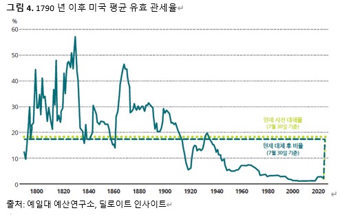 예일대 예산연구소(The Budget Lab, TBL)에 따르면, 트럼프 대통령이 올해 1월에 취임한 이후 발표한 관세 부과로 인해 지난달 30일 현재 미국의 실효 관세율은 지난 1934년 이후 최고치인 17.5% 수준으로 추산된다. 지난 1일까지 무역 합의에 도달하지 않은 국가들에게 15~20%의 관세가 부과된다고 할 때 미국 실효 관세율은 1930년 스무트-홀리법 이후 최고 수준인 20%에 육박할 것으로 보인다. 이러한 고율 관세 장벽은 세계 무역 질서의 재편을 초래할 수 있다.