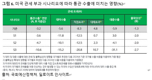 지난 5월에 국회예산정책처가 내놓은 '미국 관세 정책의 시나리오별 영향' 분석에 따르면, 미국 관세 정책으로 올해 한국 수출액이 최소 3.6%에서 최대 10.6% 감소할 수 있는 것으로 분석됐다. 예산정책처는 시나리오 분석에서 3가지 예상 시나리오를 예상했는데, 그 중에서 가능성이 높은 시나리오 1과 2의 경우 한국에 대한 미국의 관세율은 15%로 예상했다. 이는 보편관세 10%와 자동차, 철강 알루미늄에 대한 품목 관세율 25% 및 50% 부과의 경우에 해당하는 것이다.