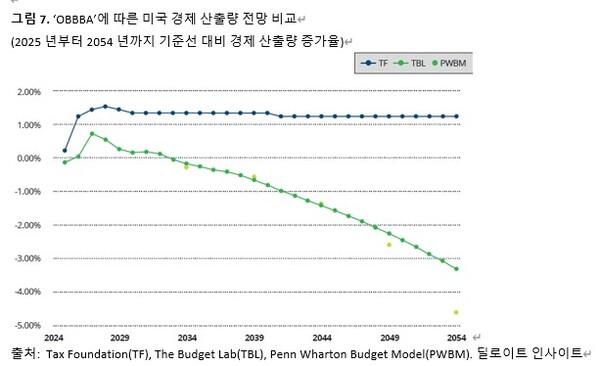 특히 TBL의 상원 법안에 기반한 분석에 의하면 OBBBA는 10년 동안 3조 달러(기간 GDP의 0.84%)의 부채를 늘리고, 2025-2055년 기간 동안으로 보면 무려 12조 1000억 달러(기간 GDP의 0.71%)의 부채를 추가할 것으로 추산된다. 임시 세금 조항이 영구화 될 경우 2025~2034년 기간의 비용은 3조 7000억 달러, 2025~2055년 기간의 비용은 16조 1000억 달러에 이를 것으로 보인다. 관련 조세 규정이 영구화 되면 오는 2055년에는 GDP 대비 부채 비율이 186%에 달할 것으로 예상된다. 이렇게 큰 부채 비율을 가진 나라는 현재 선진국 중에서는 일본 밖에 없다.