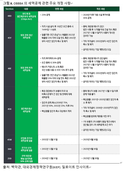 또 미국의 조세 및 재정 패키지 법안 2025년 예산조정법, 이른바 '하나의 크고 아름다운 법'(One Big Beautiful Bill Act, OBBBA)이 정식 발효됨에 따라 친환경 및 반도체 산업 관련 지출예산 및 세액 공제가 감축되거나 조정됐을 뿐아니라 동맹국 중심 공급망 재편이 이뤄지면서 한국 기업의 수출, 현지법인 운영 및 투자, 공급망 설계 등에 근본적인 충격을 줄 것으로 보인다.