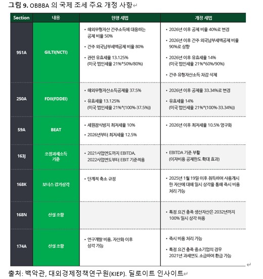 한편 OBBBA 중 한국 기업과 투자자들에게 영향을 미칠 수 있는 국제 조세 관련 개정 사항이 존재한다. 먼저 해외무형자산소득공제(Foreign-Derived Intangible Income, FDII) 제도의 실효세율이 기존 13.125%에서 14% 수준으로 소폭 인상된다. 기존 공제율이 37.5%에서 오는 2026년 이후에는 33.34%로 변경돼 유효세율이 올라간 것이다. 이번 개정을 통해 명칭은 FDDEI(Foreign-Derived Deduction Eligible Income)로 변경됐다. 이 제도는 특정 요건을 충족할 경우 미국 내에서 개발 및 생산된 무형자산에서 발생하는 해외 소득에 대해 공제를 통한 실효세율을 인하함으로써 미국 기업의 수출을 장려하고 미국 내 투자를 유인하는 제도이다. 당초 시행령에서는 2025년부터 적용 세율이 21.875%로 유효세율이 16.4%로 올라가야 하지만 이번 개정에서는 인상폭이 소폭에 그친 것이다.