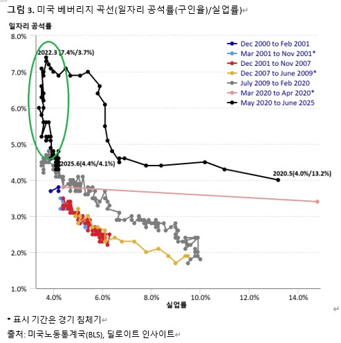 정형화된 베버리지 곡선을 통해 보자면 지난 2022년 3월부터 현재까지는 곡선 상에서 구인율 대비 실업률 비율(V-U ratio)이 매우 높은 구간에서 평균적인 비율까지 하락하는 구간으로 볼 수 있다. 곡선의 좌상단에서 기울기가 가파를 때, 이직률이 일정하다고 가정하면 구인율 감소에 따른 실업률의 변화가 매우 작은 특징을 보인다. 평균적인 V-u ratio구간을 지나 우하단 쪽으로 이동할 경우 구인율 하락에 따라 실업률이 빠르게 상승할 수 있다.