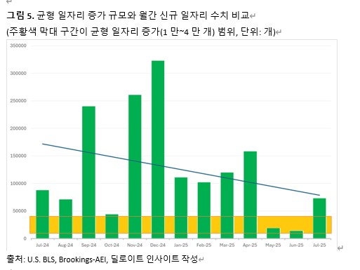 그런데 브루킹스(Brookings)와 전미기업연구소(AEI)의 최신 연구 결과, 이민 감소와 노동력 감소로 인해 균형 일자리 창출 규모가 불과 월 1만~4만 개 수준으로 급격히 낮아진 것으로 나타났다. 올해 7월 미국 노동시장의 신규 일자리 수는 7만3000개로 이전 10년간 월 평균 14만7000개의 절반 수준에 그치는 등 기대 이하였지만, 이 정도라면 충분히 실업률이 안정될 수 있는 수치인 셈이다. 심지어 5월과 6월 수정치를 감안한 최근 3개월 평균 신규일자리 수 3만5000개도 균형 일자리 창출 범위에 속한다.