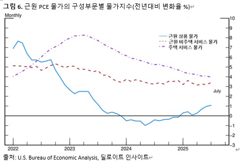 이후 인플레이션에 대해 설명한 파월 의장은 관세 인상으로 인해 일부 상품(goods) 가격이 상승한 것에 주목했다. 개인소비지출(PCE) 물가는 올해 7월까지 12개월 동안 2.6% 상승했고, 변동성이 큰 에너지와 식품을 제외한 근원PCE 물가는 2.9% 올라 1년 전보다는 강화됐다. 특히 근원 물가 중에서 근원 상품 물가가 1년 동안 1.1% 상승해 지난해 하락세에서 벗어난 것이 눈에 띄는 변화였다. 주택서비스 물가는 하락세를 유지하고, 비주택서비스 물가는 과거 2% 수준이던 물가 상승률보다 약간 높은 수준이다.