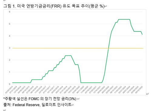 전체적으로 보면 이제는 연준을 주도하는 분위기가 인플레이션보다 고용 쪽에 좀더 관심을 부여하고 있다. 연준은 지난 2024년 최고 5.25~5.50%이던 연방기금금리를 9월 회의부터 12월 회의까지 3차례에 걸쳐 총 100bp 인하한 뒤, 트럼프 행정부의 정책에 대한 불확실성과 인플레이션 압력을 감안해 금리 인하를 중단했다.