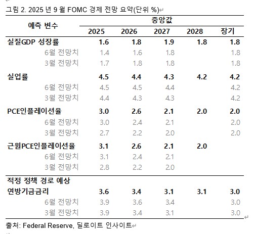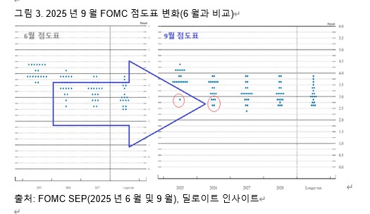 특히 6월과 비교해 9월 점도표의 특징은 올해의 경우 3% 아래까지 큰 폭의 금리 인하를 주장하는 점이 1개(미란 이사로 추정) 추가됐고, 2026년 전망이 크게 분산된 것이 눈에 띈다. 모두 19개의 점 중에서 중앙값인 3.6%에 단 6개의 점만 모여 있는 반면, 3% 이하인 2.9%와 2.6%에 각각 3개와 2개의 점이 표시돼 있는데 이는 6월까지만 해도 각각 1개에 불과했던 것이다. 금융시장 전문가들은 최하단 금리 예측인 2개의 점은 미란 이사 외에 월러 이사로 구성되었을 것으로 추정한다.