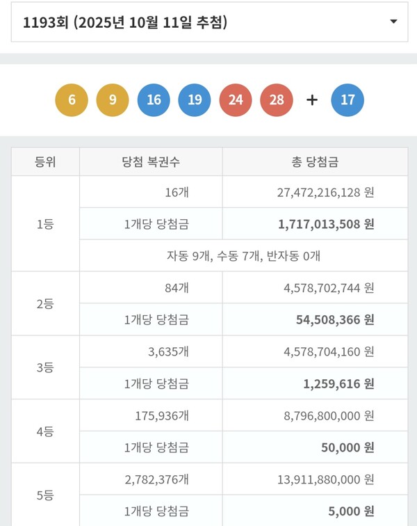 당첨번호 6개를 모두 맞힌 1등 당첨자는 16명으로 집계됐다. 이들에게는 17억1701만원씩 지급된다.